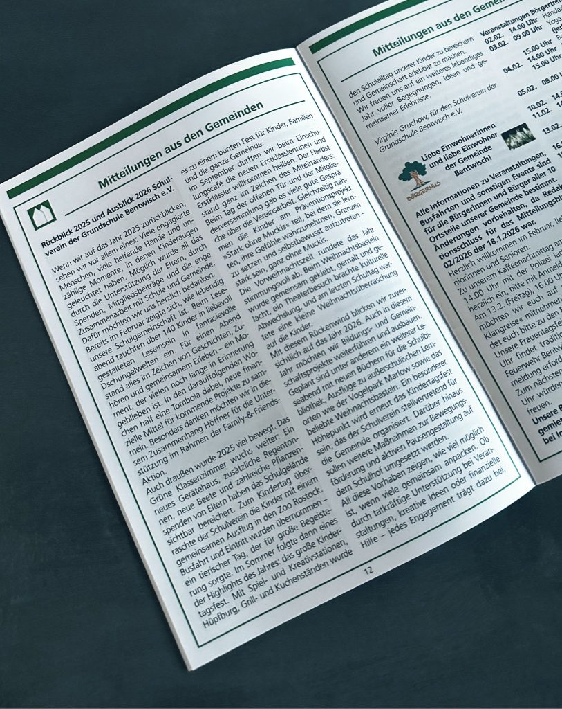 im aktuellen Gemeindeblatt findet ihr einen schönen Rückblick auf das Jahr 2025 und einen Ausblick auf 2026 aus Sicht unseres Schulvereins der Grundschule Bentwisch 🏫💚